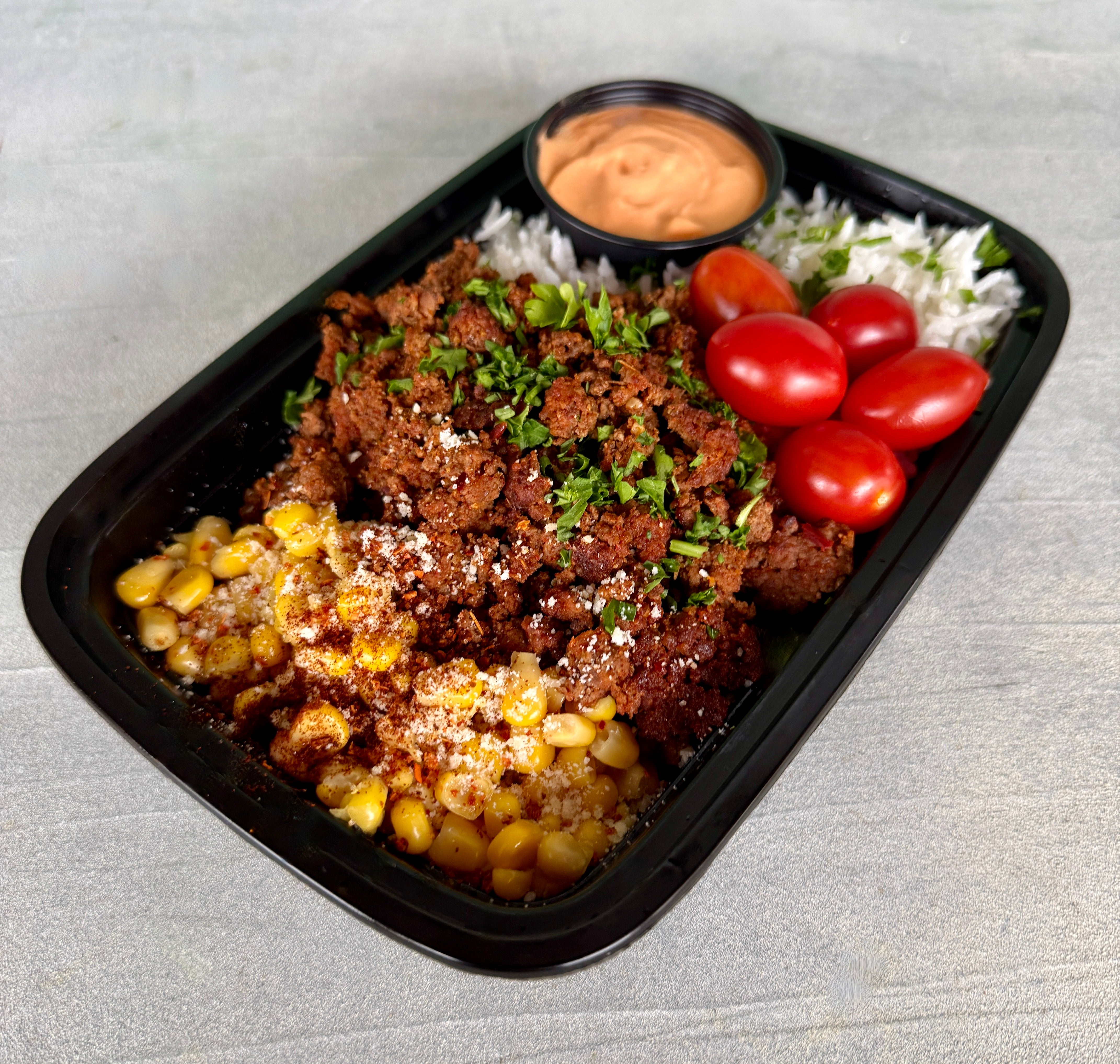 Seasoned ground beef over white rice with fire-roasted corn and fresh tomatoes, served with our house-made chipotle mayo on the side.