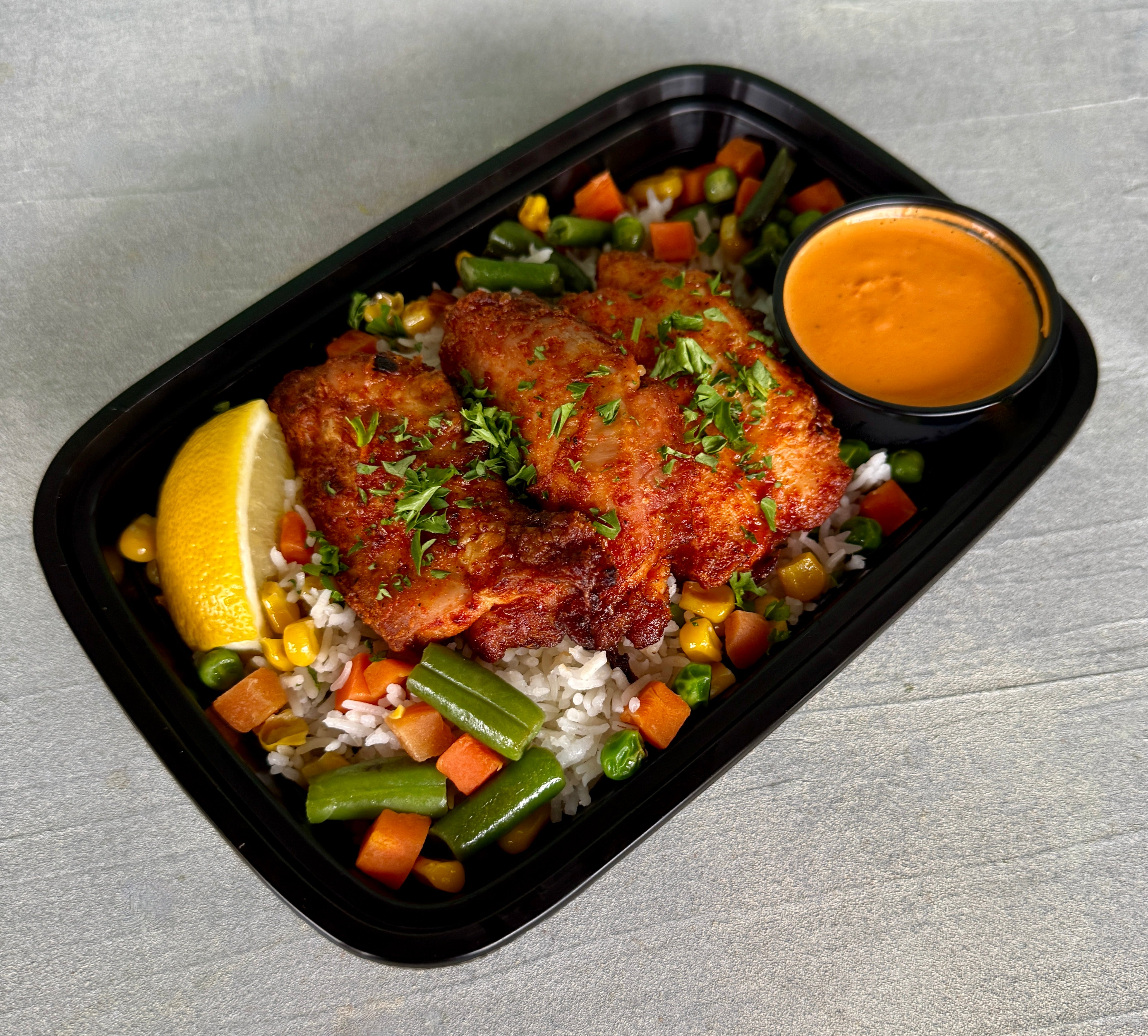 Roasted garlic chicken, marinated in our signature house sauce and cooked to stay juicy and tender. Paired with rice blended with a nutrient-rich vegetable medley, plus a smooth roasted bell pepper sauce on the side.